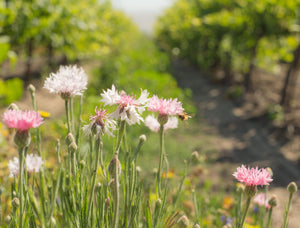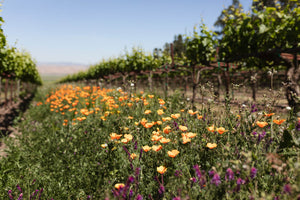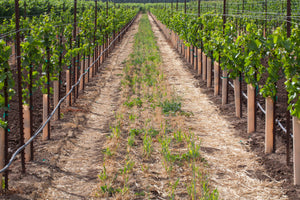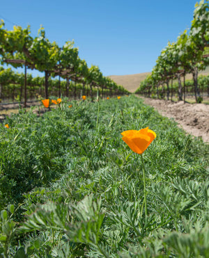 Planting of a variety of cover crops between vineyard rows to improve soil health naturally, prevent erosion, control vine vigor, and discourage weeds